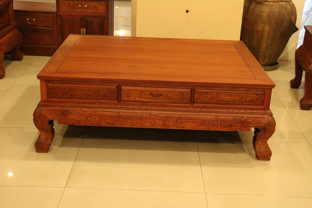 然后是沙發的座面,溫潤細實,經燙蠟工藝處理后的緬花木面更帶有一種淡淡地透亮光澤,古香古韻。再在下方位置,束腰及牙條部分同樣還有幾些人物、花草、幾何紋飾以及祥云之浮雕雕刻,給人以一種如履仙境之感,藝術畫面感極為強烈!